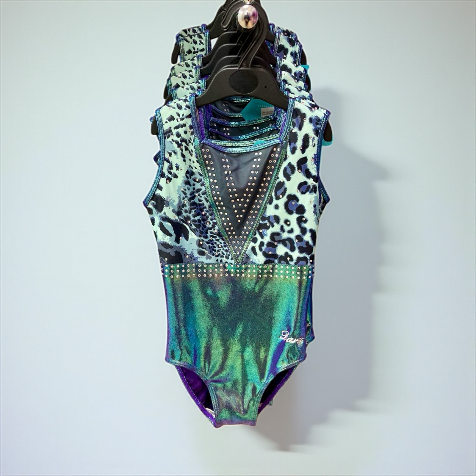 تألقي بهذا الرومبير الرائع ثنائي اللون، بنقشة قوس قزح العنبية الساحرة، وصدرية أنيقة من الليكرا بطبعة فهد، ونقشة أحجار الراين المبهرة. مثالي لإطلالة جريئة في كل عرض!