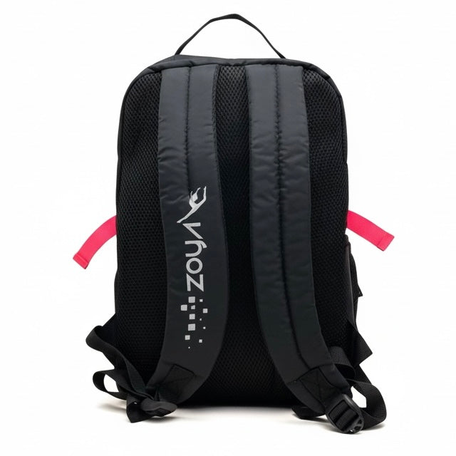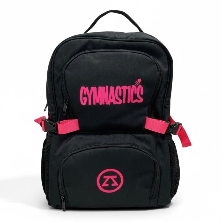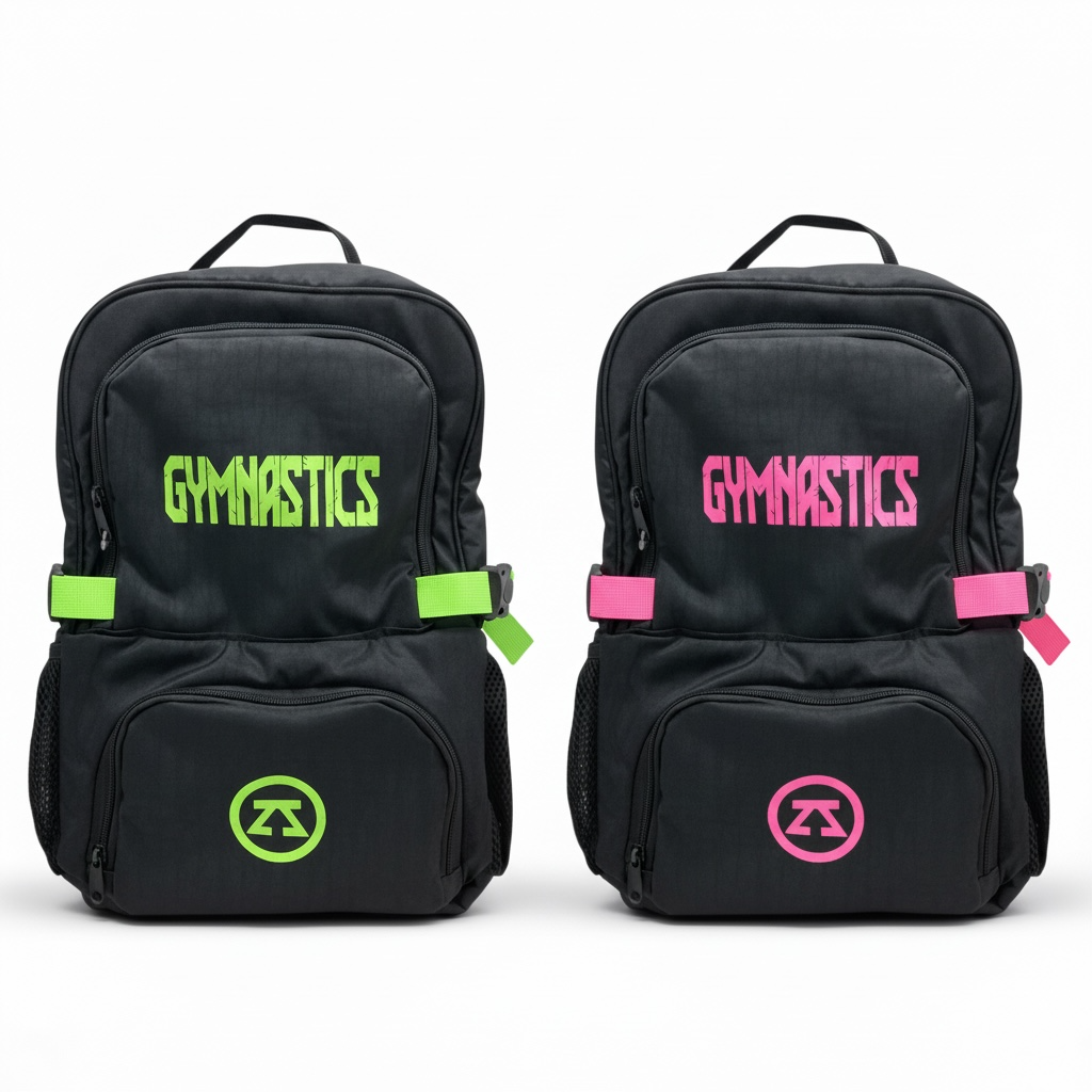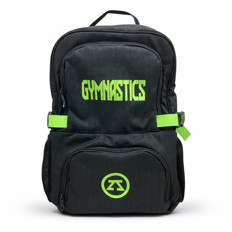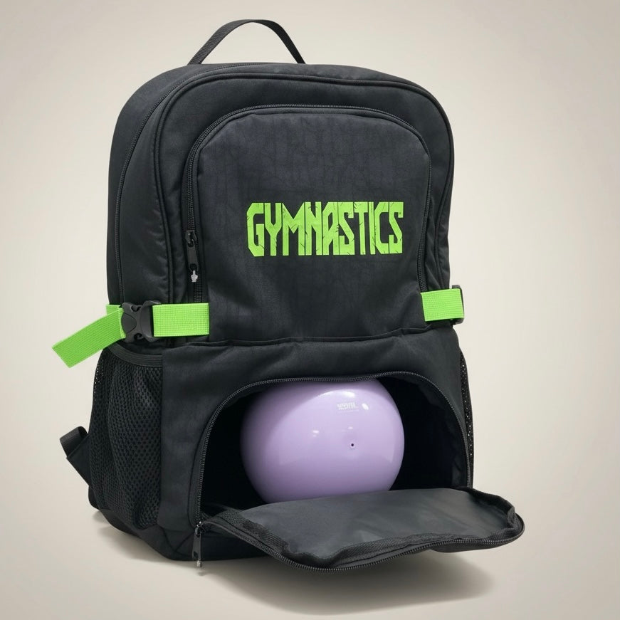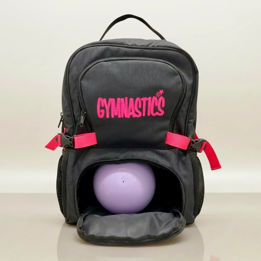 حقيبة الظهر اللامعة من زويا للجمباز تشمل قسم لكرة الجمباز الإيقاعي مع هدية مجانية عبارة عن حقيبة شبكية ببطاقة اسم اللاعبة لجميع أدوات الجمباز الأخرى.