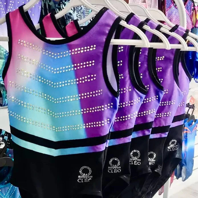 Discover the Ava Mystique leotard that features a sleek black, shiny bottom paired with a vibrant blend of purple, sky blue, and pink on the upper part, adorned with sparkling rhinestones. Perfect for standing out in every routine.