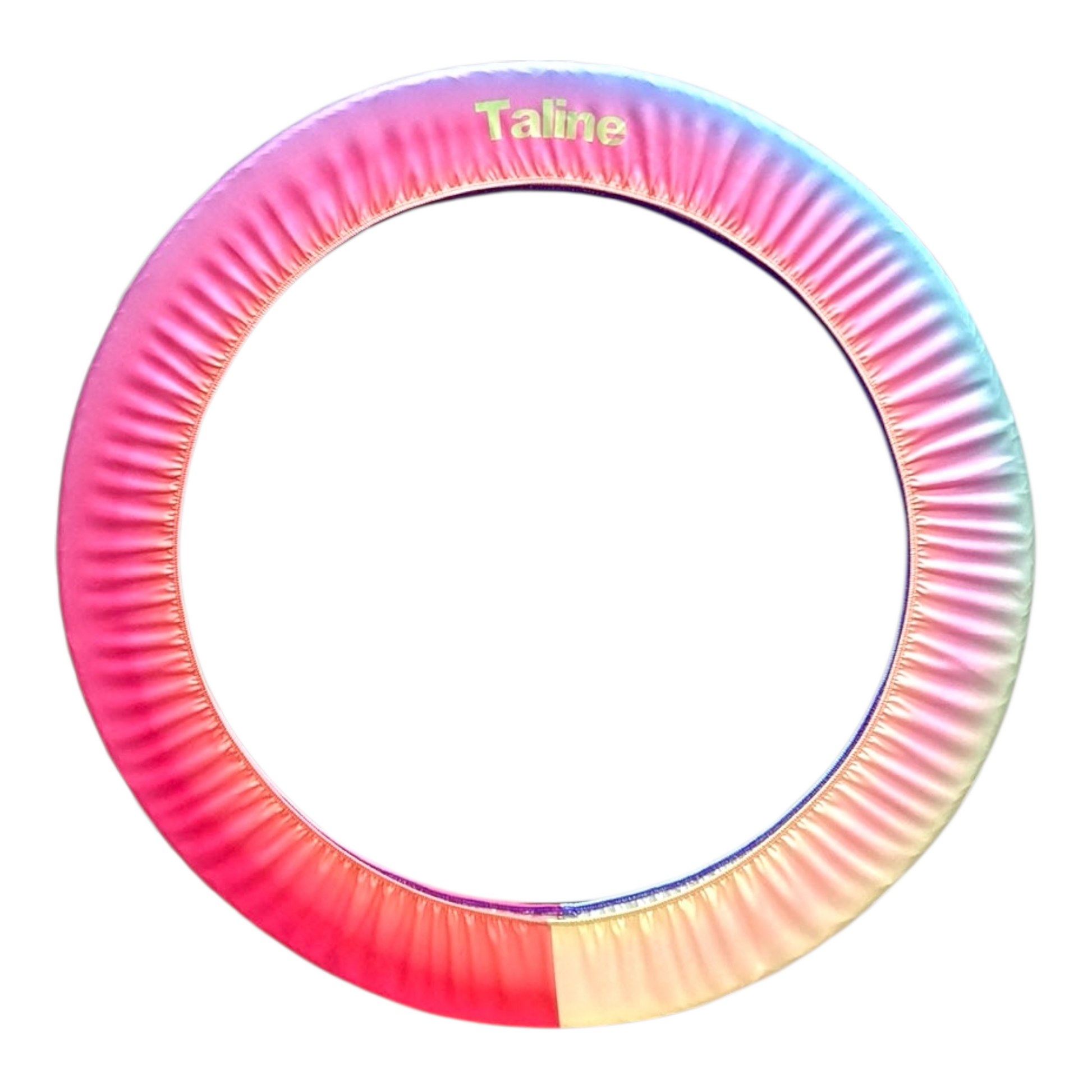 This hoop cover has a dreamy pastel gradient with soft transitions between aqua, mint, lavender, and bright pink — giving off a fresh, playful, and vibrant vibe.