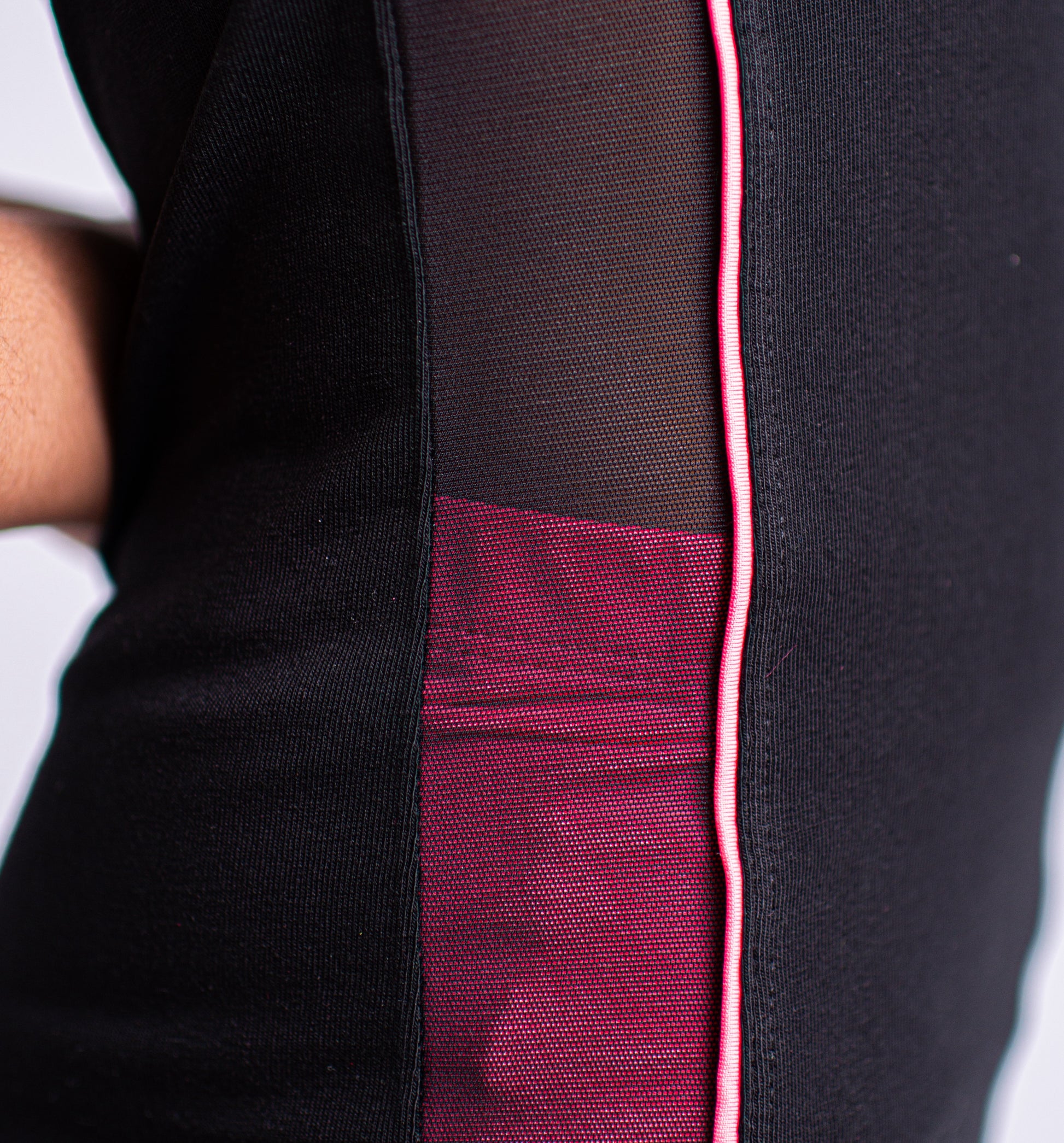 Fitted black T-shirt with closed blades. Side inserts made of black knitted mesh.
