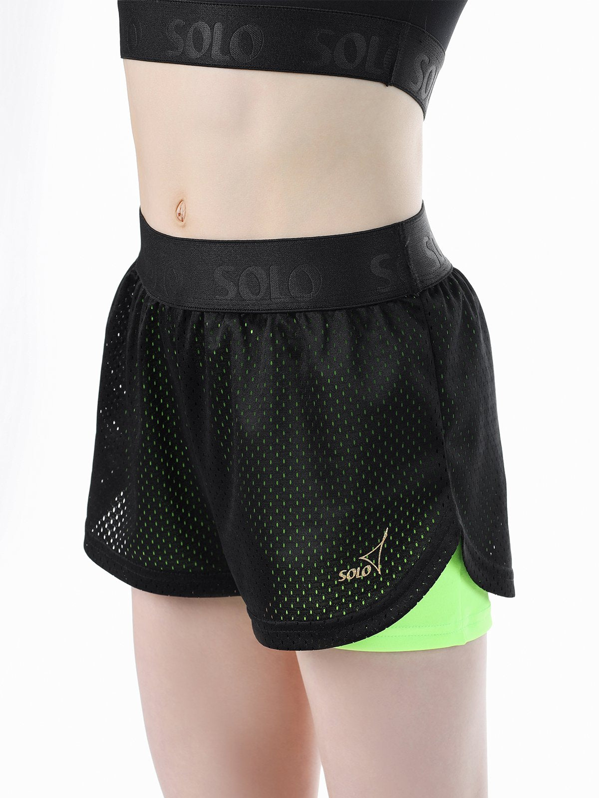 Double short shorts: upper ones - loose, made of black knitted mesh, lower ones - tight-fitting, made of elastic polyester of neon color.